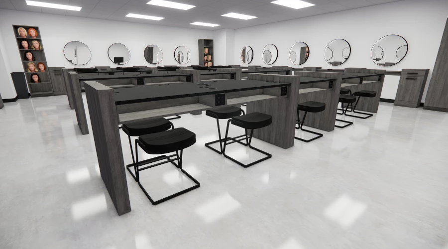 CTE programs span a variety of industries, from cosmetology to veterinary technical education. For students to fully engage, they need spaces that replicate professional settings. A cosmetology classroom, for example, should have the same functional styling stations and equipment found in contemporary salons. Similarly, a vet tech program should resemble an animal health care workspace with ergonomic cabinetry.