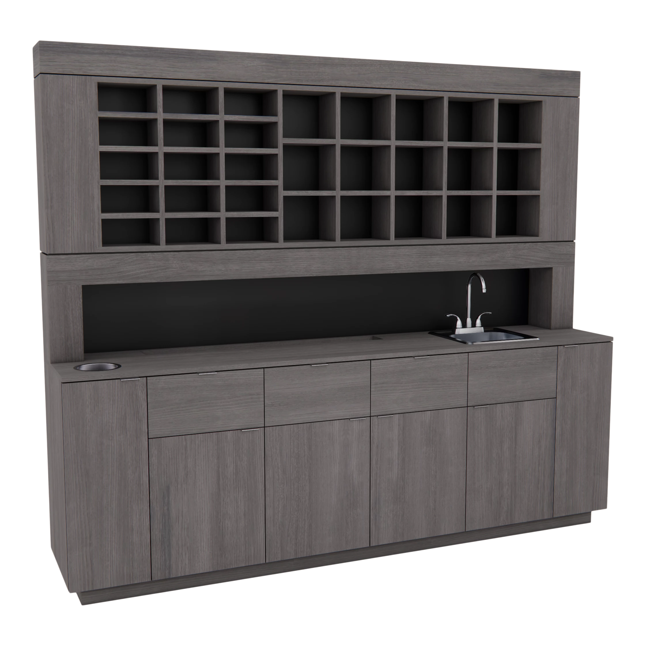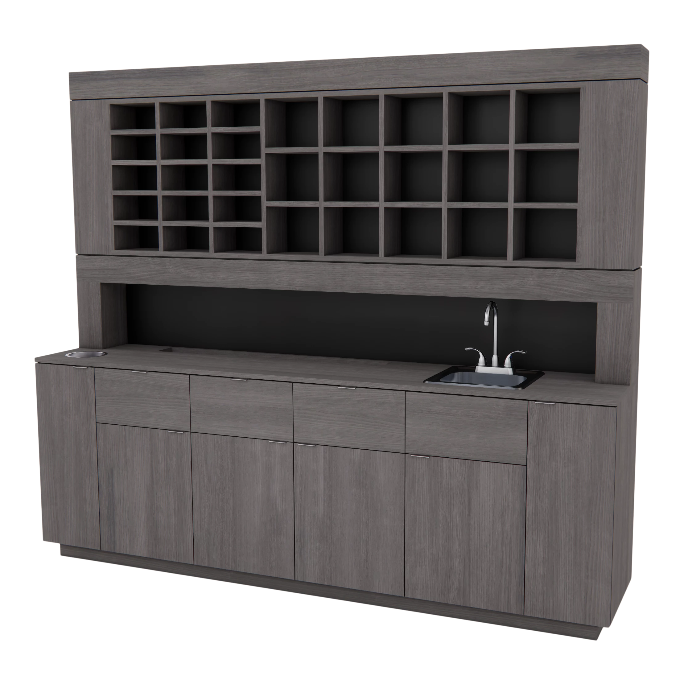 The Kaemark Royal Color Bar is designed to meet the sophisticated demands of the beauty industry. This exceptional unit boasts a sunken bottle well and expansive color storage, making it an indispensable asset for any salon aiming to streamline their color service operations. It features several lower cabinets and storage drawers, providing ample space for additional products and supplies. The inclusion of a thin storage cabinet with an adjustable shelf and a slot for a dirty towel hamper further enhances its utility. For salons seeking a fully customized solution, options such as adding a sink, LED lights, and even a branded light box are available, allowing you to tailor the unit to your unique brand identity and operational needs.