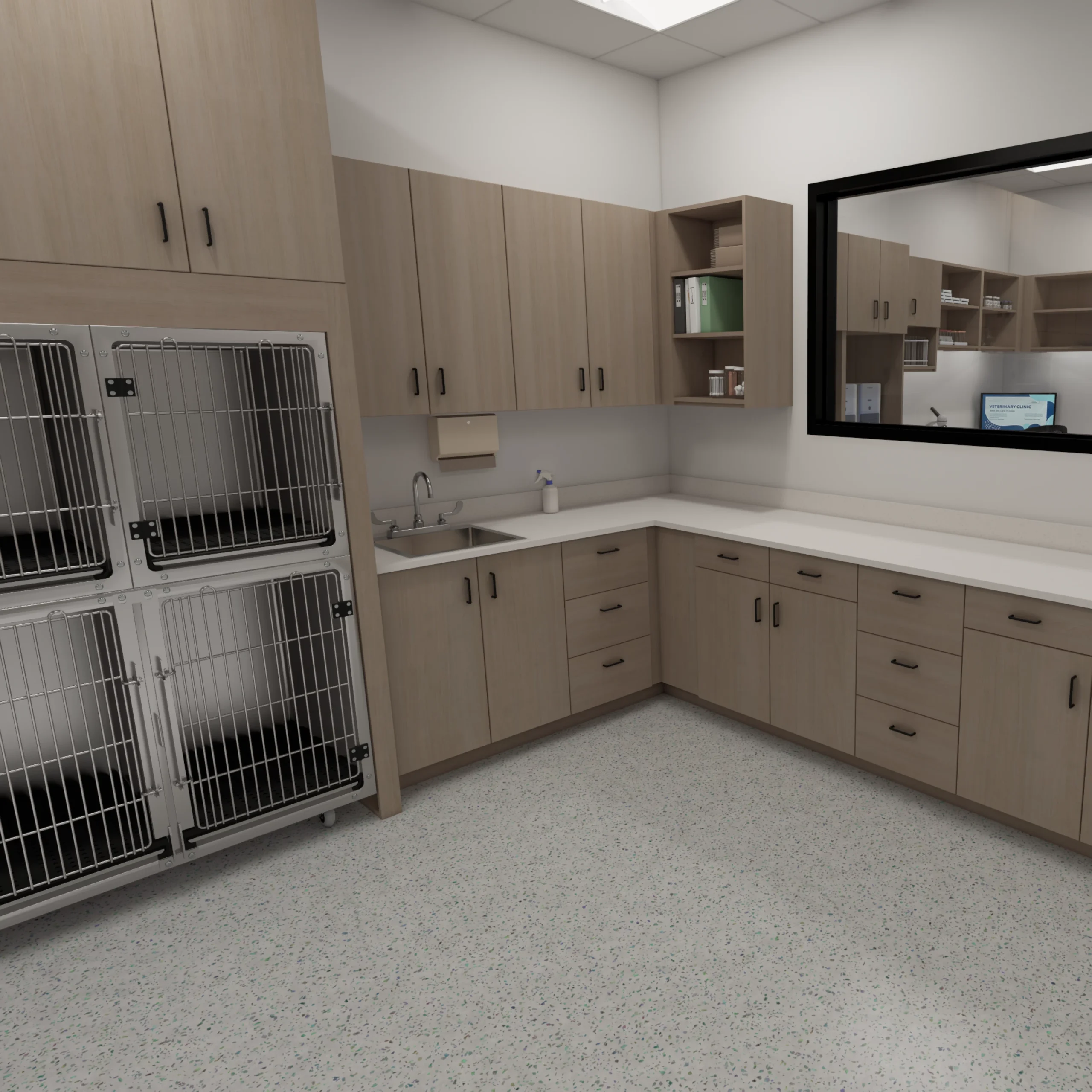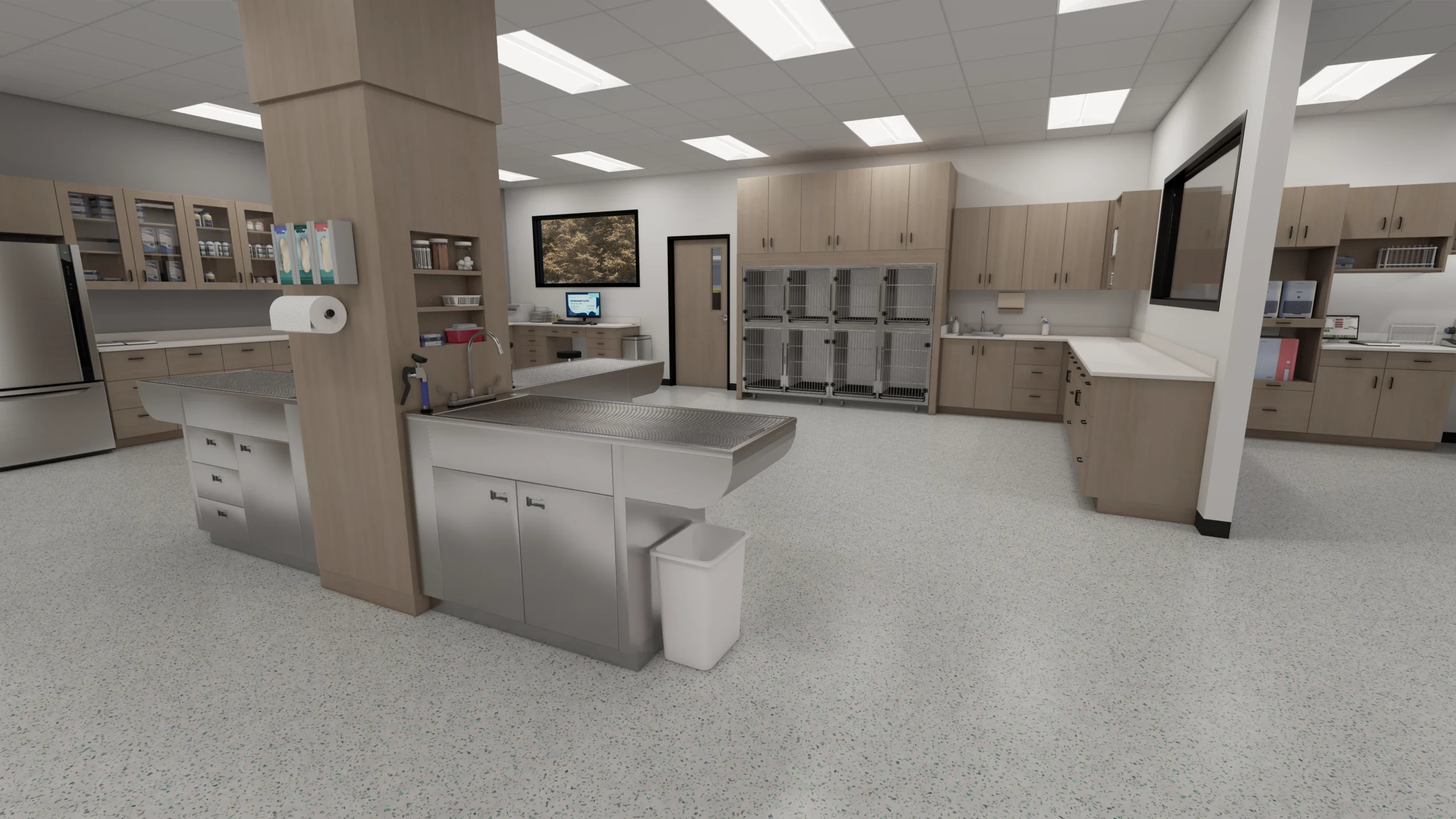 Explore an example clinic expertly rendered by our design team, showcasing the most efficient and effective design solutions tailored for modern veterinary practices.